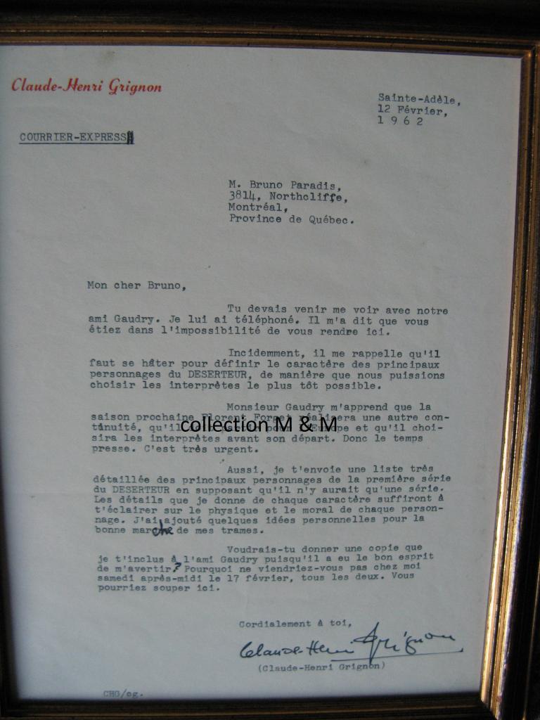 - Lettre originale de Claude-Henri Grignon à Bruno Paradis, réalisateur